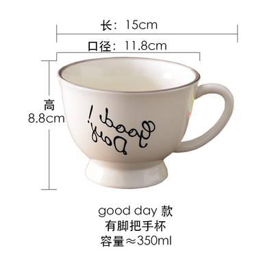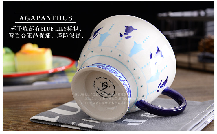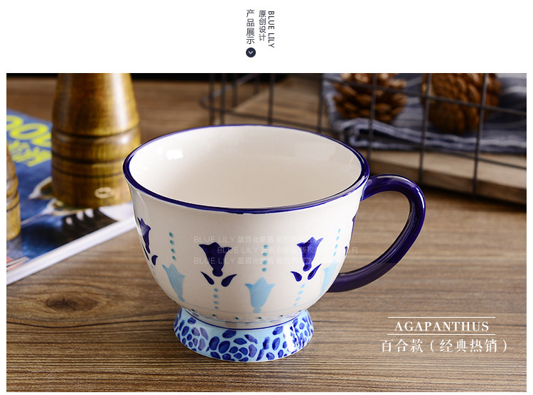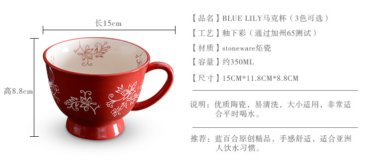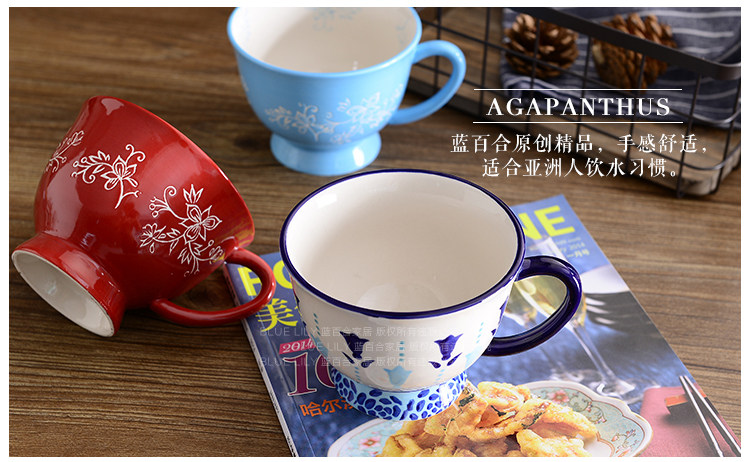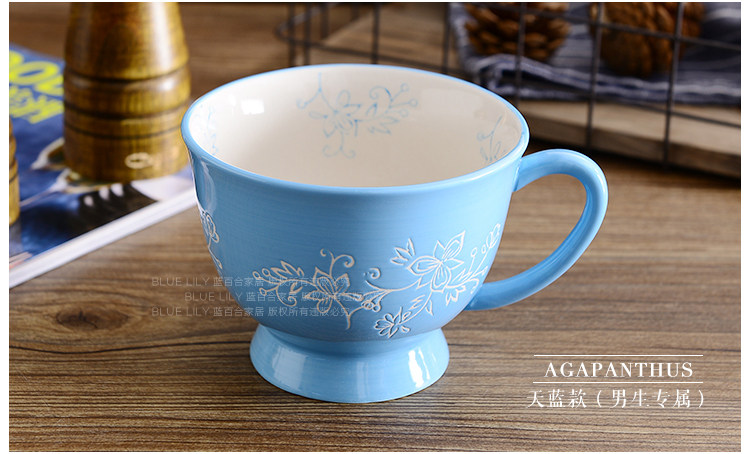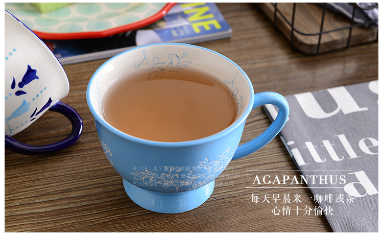 天蓝酒红手绘釉下彩 刻花陶瓷马克杯情侣闺蜜杯咖啡杯