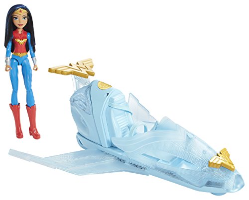 -. Feature : Take on missions with the DC Super Hero Girls action dolls inspired by the students of Super Hero High / Wonder Woman doll comes with her translucent Invisible Jet that has surP.R.Ise features -- it rolls on wheels, it expands to make room for two and it shoots a projectile / Press the button toward the back of the jet, then extend its body with a pull to reveal room for two -- each seat even has a seat belt / Push the button toward the front of the jet and watch the iconic golden winged Wonder Woman emblem shoot from the hood / Wonder Woman action doll wears an exclusive flying outfit designed in her signature red and blue and accessorized with details like her wrist cuffs, belt and Wonder Woman chest emblem, plus iconic accessories that include her red boots and tiara