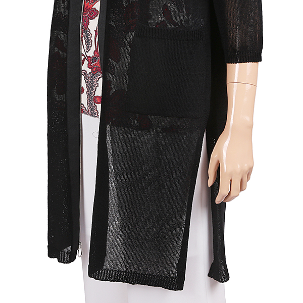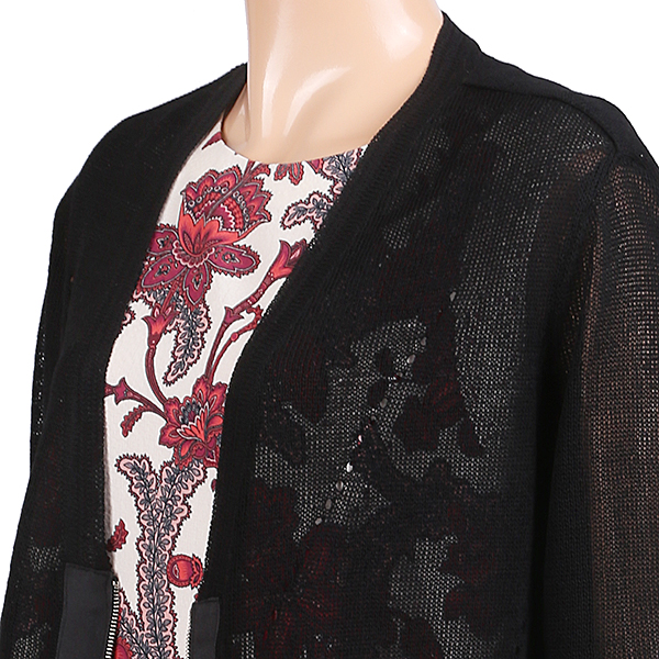 이 제품은 V넥목선의 세련됨과 앞여밈의 지퍼에 테이핑의 고정으로 니트와 지퍼의 들뜸이 없이 단단하고 야무지며