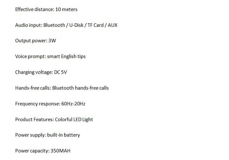 Audio input: Bluetooth / U-Disk / TF Card / AUX