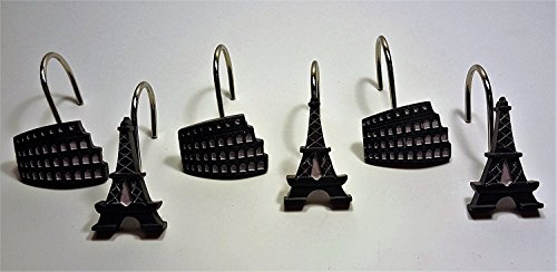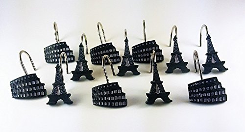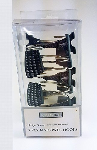 Paris Stamps Shower Curtain Hooks - Black /White, Set of 12