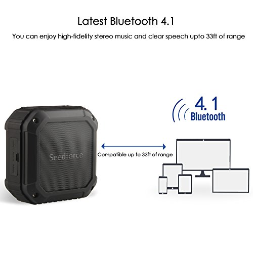 VERSATILE CONNECTION + SPEAKERPHONE + NFC - We use the latest Bluetooth 4.1 Technology - Connect your devices via Bluetooth in less than 3 seconds... or use the Seedforce as a speaker for that important phone call! You can easily control songs and adjust the volume at the speaker. Compatible up to 33ft of range so the music is there for you no matter whether you're at home, in the shower, on the road, or even kicking back at the beach or pool!