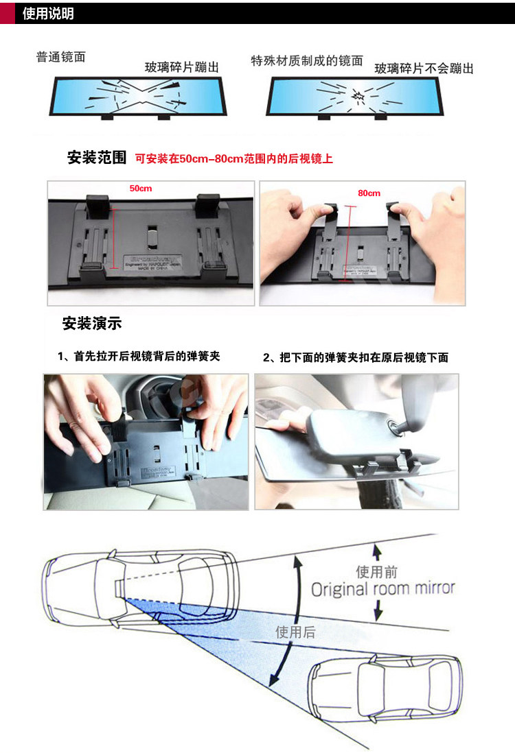 3, using high-quality flat glass mirror, unique design prevents glass from scattering, even serious accident, the mirror is completely broken, the glass will not splash out, to ensure road safety.