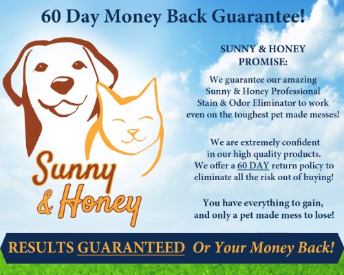 - Feature : #1 PROFESSIONAL'S CHOICE - Sunny & Honey Professional Stain & Odor Eliminator is the #1 Professional's choice when it comes to cleaning up a mess caused by dogs, cats, and other animals. This product has a unique Bio-Enzymatic formula that is tough on stains and odors caused by urine, feces, vomit, and drool. The Natural Bio-Enzymatic formula gets to the root of the problem quickly and eliminates it completely - not simply masking the smell. The enzymatic bacteria are activated when sprayed upon a stain and odor problem area. The bacteria eat away at the mess and eliminate the stain and odor completely. Once the stain and odor are gone, the bacteria dry up and disintegrate. Leaving nothing but a clean and fresh surface behind! / CLEAN IT ALL - The days of buying specific cleaners for carpet, floors, or your automobile are gone! Sunny & Honey Professional Stain & Odor Eliminator cleans it all! This fantastic cleaning solution is great for carpets, rugs, hardwood, tile, cloth and leather furniture, animal bedding, automobiles, rv's, pet crates, litter boxes, pet travel bags, and many other uses! Sunny & Honey Professional Stain & Odor Eliminator cleans up the entire stain, removes the odor, and discourages your pet from marking in the same area again. This cleaning solution has a pleasant fresh peppermint scent. / CHILDREN & PET SAFE - We genuinely care about the safety of your children and pets. That is why Sunny & Honey Professional Stain & Odor Eliminator is completely safe to use around your children and pets. The Natural Bio-Enzymatic formula does not contain any harmful chemicals. Therefore, Sunny & Honey is children, pet, and earth friendly. Sunny & Honey Professional Stain & Odor Eliminator is certified by The Carpet and Rug Institute, which also approved the safety of this product around children and pets. We take safety seriously! / GUARANTEED HIGHEST QUALITY - Sunny & Honey Professional Stain & Odor Eliminator is manufactured in the United States. We are proud of our manufacturing facility, which uses only the highest quality ingredients available. Sunny & Honey Professional Stain & Odor Eliminator is certified by The Carpet and Rug Institute. The CRI seal of approval means that this product was rigorously tested and it was proven to clean up organic stains and odors in a very effective and efficient manner. The Carpet and Rug Institute states that this product will not damage your investment that you are cleaning. No more worrying if it will ruin your brand new rug or carpet! / RISK FREE GUARANTEE - We Guarantee that Sunny & Honey Professional Stain & Odor Eliminator is the best product to clean up a pet mess! It was made with the best ingredients available to conform to our highest standard of quality. It simply does not get any better than this! We are so confident in our products that we offer a 100% 60-Day Money Back Guarantee. If you are not completely satisfied with the way this product works for you - send it back for a full refund. You have everything to gain, and only a pet-made mess to lose! Click - ADD TO CART - Right Now!