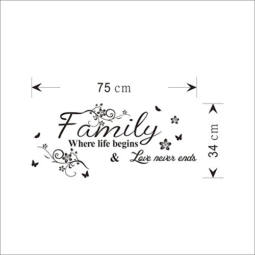 -. Binding : Kitchen -. Brand : Amaonm -. Color : Black -. EAN : 0742920311315 -. Feature : Material: vinyl;Clean, environmental protection; / Easy to Apply, Removable, Durable, Pressure Resistance, Shock Resistance, Moisture Resistance. / Provides an interesting focal point to any room and bring the outdoors into your home with this wall / The decal is vinyl and original, which is designed by Amaonm LLC., any other color or typeface you want, please contact us. / Package: Roll Package, Finish reference picture size:34*75CM -. Label : Amaonm -. Manufacturer : Amaonm -. ProductGroup : Home -. ProductTypeName : HOME -. Publisher : Amaonm -. Studio : Amaonm -. Title : Amaonm® Removable Vinyl Quotes "Family Where Life Begins, Love Never Ends" Nursery Flower Vine Butterfly Home Art Decor Wall Stickers Murals Decals Peel Stick for Kids Room Bedroom -. UPC : 742920311315