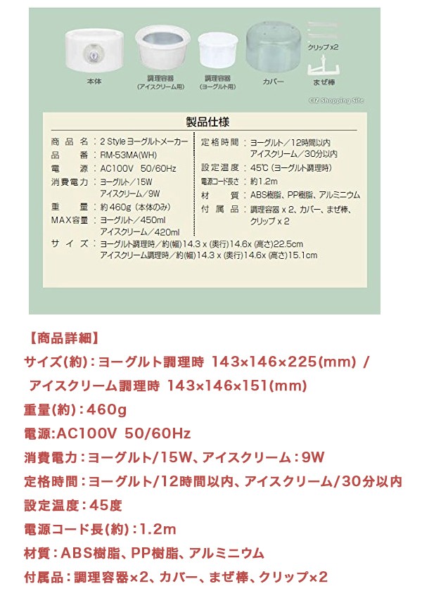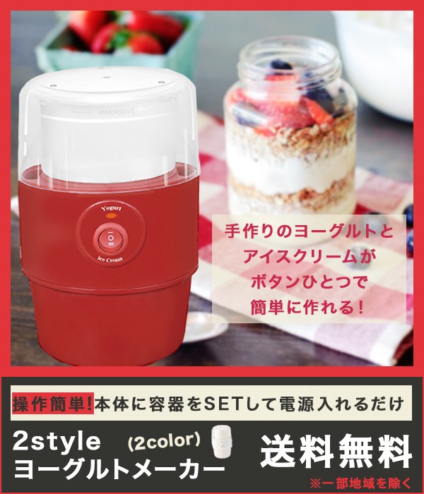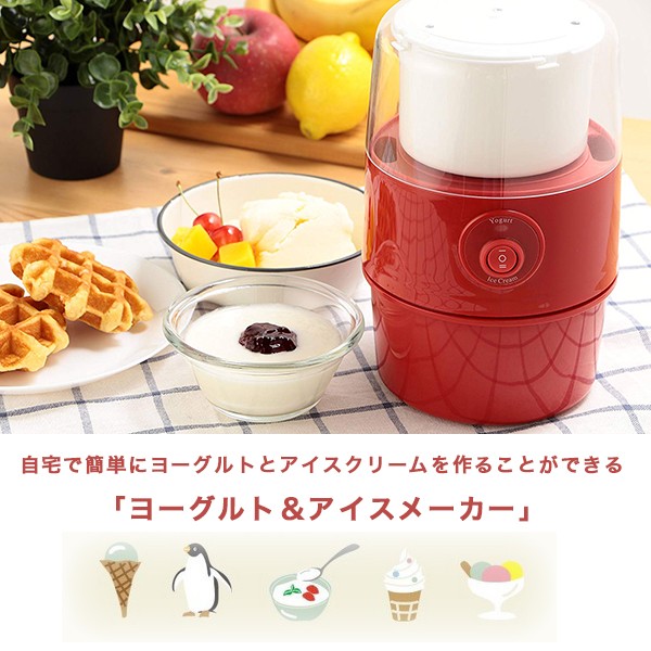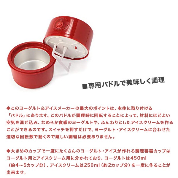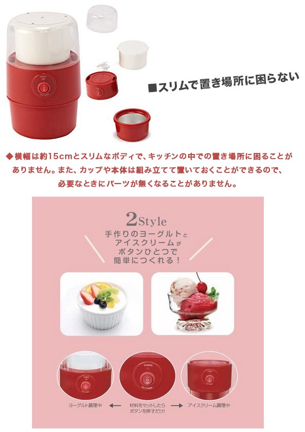 | 商品説明 | 全国送料無料!(沖縄、離島は出荷不可となります) ◆1台2役!これ一台でヨーグルトとアイスクリームが作ることができるヨーグルト&アイスメーカー◆ 自宅で簡単にヨーグルトとアイスクリームを作ることができる「ヨーグルト&アイスメーカー」です。 プレーンでシンプルなヨーグルトや、バニラ・チョコ・ストロベリーなど多彩な味で楽しめるアイスクリームを簡単に作ることができ、アレンジも自由自在! 材料をいれてスイッチを押すだけの簡単調理で、お子様からお年寄りの方までどなたでも楽しむことが出来ます。 手作りができる最大のポイントは、 添加物やアレルギーの心配をすることなく、味やカロリーを調整しながら調理ができることです。 健康に気を遣わなければならない方でも、楽しく調理しスイーツを楽しむことが出来ます。 ■専用パドルで美味しく調理 このヨーグルト&アイスメーカーの最大のポイントは、本体に取り付ける「パドル」にあります。 このパドルが調理時に回転することによって、材料にほどよい空気を混ぜ込み、なめらか食感のヨーグルトや、ふんわりとしたアイスクリームを作ることができるのです。 スイッチを押すだけで、ヨーグルト・アイスクリームに合わせた適切な回転数で動くので難しい調理は必要ありません。 ■大きめのカップで一度にたくさんのヨーグルト・アイスが作れる 調理容器カップはヨーグルト用とアイスクリーム用に分かれており、ヨーグルトは450ml(約4~5カップ分)、アイスクリームは250ml(約2カップ分)を一度に作ることが出来ます。 ■スリムで置き場所に困らない 横幅は約15cmとスリムなボディで、キッチンの中での置き場所に困ることがありません。 また、カップや本体は組み立てて置いておくことができるので、必要なときにパーツが無くなることがありません。 【商品詳細】 サイズ(約):ヨーグルト調理時 143×146×225(mm) / アイスクリーム調理時 143×146×151(mm) 重量(約):460g 電源:AC100V 50/60Hz 消費電力:ヨーグルト/15W、アイスクリーム:9W 定格時間:ヨーグルト/12時間以内、アイスクリーム/30分以内 設定温度:45度 電源コード長(約):1.2m 材質:ABS樹脂、PP樹脂、アルミニウム 付属品:調理容器×2、カバー、まぜ棒、クリップ×2 |