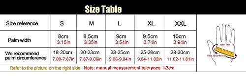 -. Feature : Is currently the most popular international models not only play a decorative role, that is breathable and difficult to penetrate rain / The use of elastic spandex fibers with good ventilation, stability, warmth, wear-resistant, quick-drying, anti-shock / Can freely adjust the tightness does not appear baggy phenomenon / Material savings without adding more slip resistant materials, natural environment, no odor.Suitable for all outdoor sports enthusiasts / Sizes: Small: 16CM-18CM (palm circumference); Medium: 18CM-20CM (palm circumference); Large: 20CM-23CM (palm circumference); X-Large: 23CM-25CM (palm circumference)