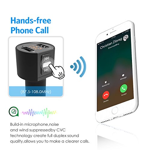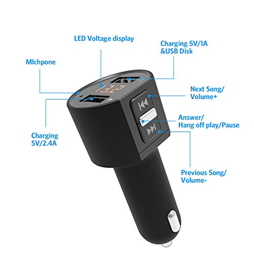 - Plug the FM transmitter into your vehicle’s lighter or power port. The LED displays the voltage of car battery 5 seconds.
