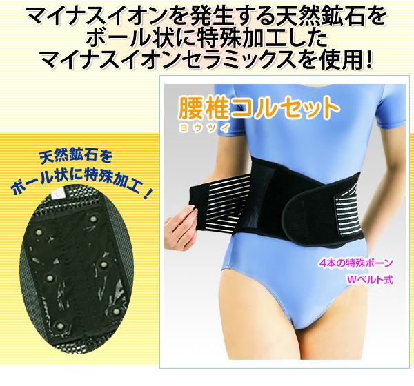 天然鉱石をボール状に特殊加工した腰椎コルセットで心地よくリラックス♪伸縮するパワーネットでしっかり支え、ムレにくいメッシュで着け心地も快適です。