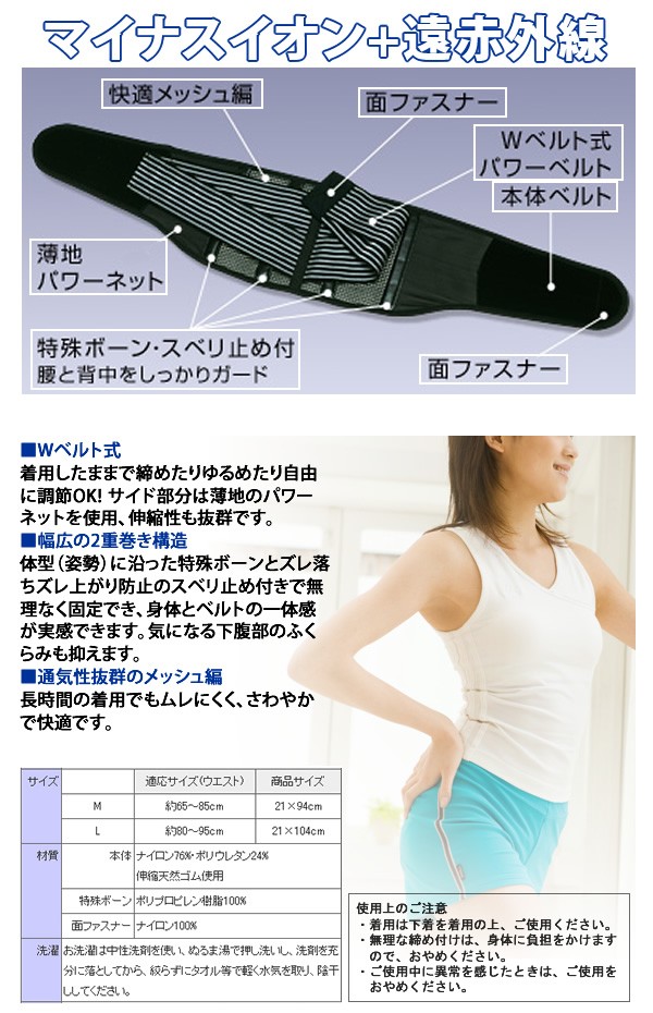 天然鉱石をボール状に特殊加工した腰椎コルセットで心地よくリラックス♪伸縮するパワーネットでしっかり支え、ムレにくいメッシュで着け心地も快適です。サイズ/M(ウエスト):約65~85cm L(ウエスト):約80~95cm 素材・材質/本体:ナイロン76%、ポリウレタン24%伸縮天然ゴム使用 特殊ボーン:ポリプロピレン樹脂100% 面ファスナー:ナイロン100% 製造国/日本 ※サプライヤー直送品 ご注文後、当日~1営業日後の出荷となります【商品名】腰椎コルセット M
