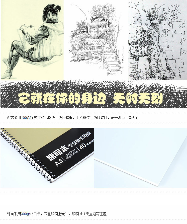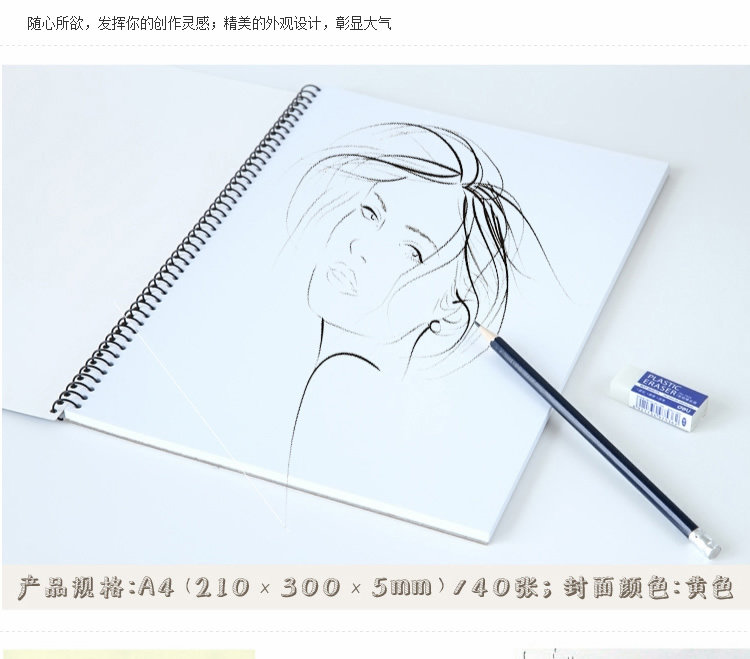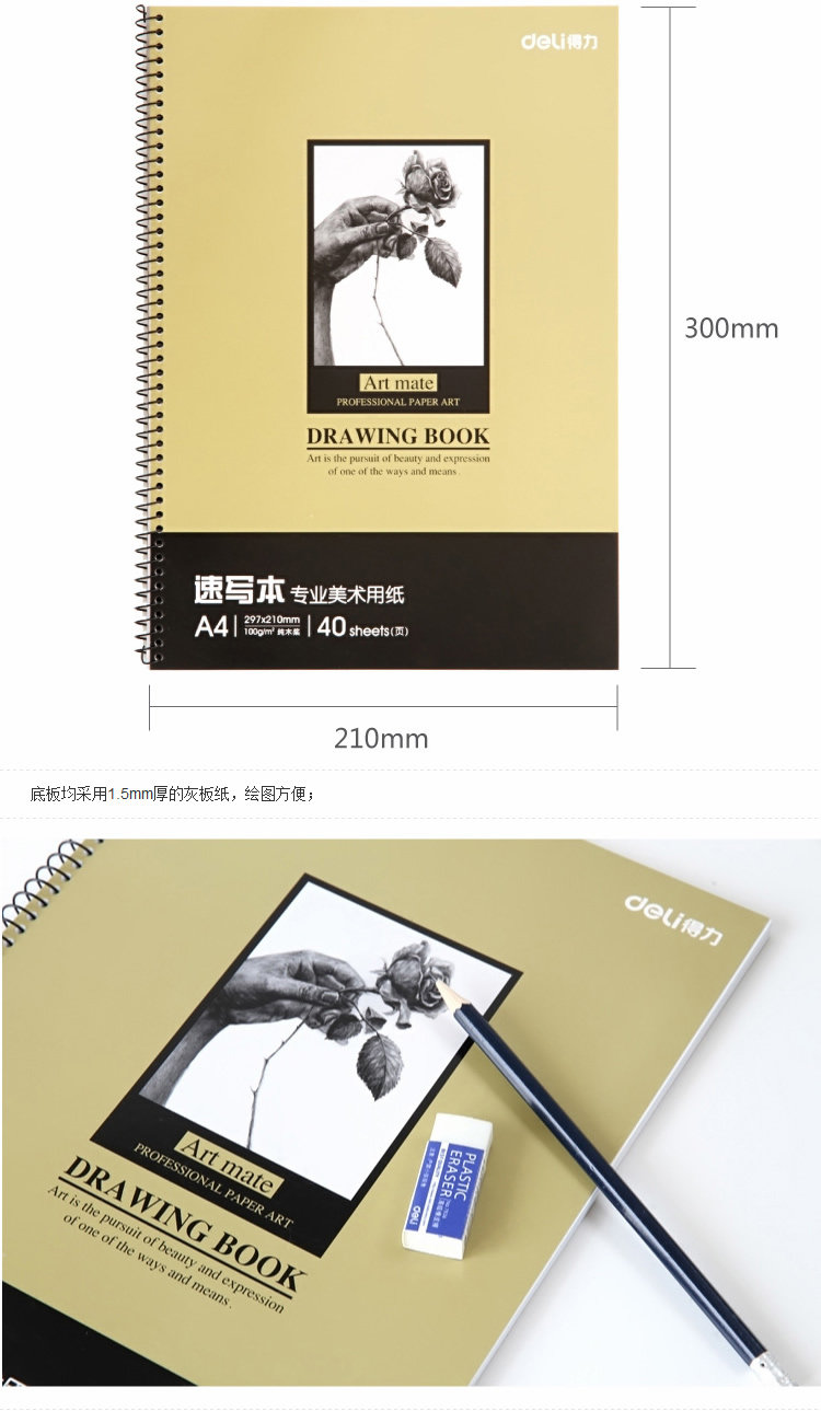 【名称】得力专业美术速写本 【编号】7696(A4) 【规格】A4(210*297mm)/40张 【颜色】黄色 蓝色,颜色随机 【重量】约0.3kg/本 【特点】高平滑质,采用100g纯木浆双胶纸;内芯采用100g纯木浆专业素描纸