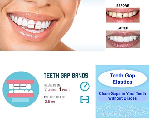 INSTRUCTIONS: * Attach the teeth gap bands to your teeth. Take one band out of the factory sealed package. Grasp each side of the band with the index finger and thumb of each hand and stretch it out. Slowly slide the band around the outside of the teeth which surround the gap you wish to close. Close to the gum line is better, but will need to be changed more often to keep clean. * Initially you may need to use mirror while placing the band around your teeth, however with time you will be able to quickly change your bands with little effort. * For the first few days the teeth the bands are attached to will be sensitive. This is normal and is sign of movement. The same sensitivity is felt by patients using braces. Do not let this sensitivity discourage you. With time, this sensitivity will subside. If needed, take an over the counter pain medication to ease the pain. * Use a new tooth gap band every night. The bands stretch with use and a new band is more effective. * Teeth gap bands should be worn a minimum of 10 hours per day. They should be removed when eating and brushing your teeth. * If you feel too little or too much pressure, you may need a smaller or larger size teeth gap band. * After your gap closes you are advised get retainer or bonding to stop movement or the gap will grow again. This is typical with braces as well. 0