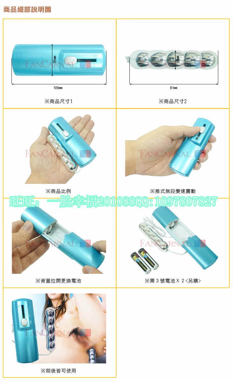 [使用方法] 六段防水葫芦,打开电池盒,按电池盒内图示装入两节五号电池,在性爱宝贝上涂上润滑液,轻轻滑入后庭,推动开关盒上的按钮,将震动幅度与频率调至感觉舒适即可。