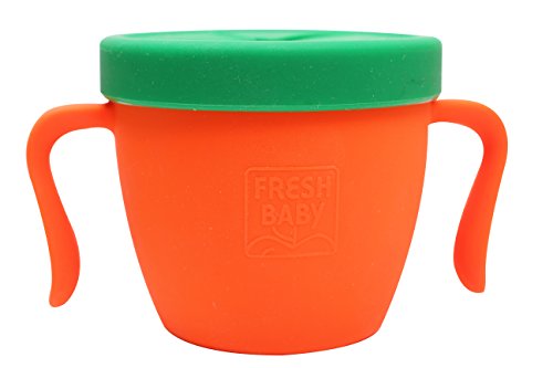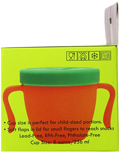Fresh Baby's snack cup is a fun container for snacks at home or on the go. The soft silicone top has flaps for small fingers to reach snacks without worrying about spills.