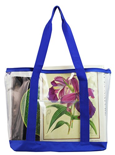 Studio : Ensign Peak Publisher : Ensign Peak Binding : Apparel Product Description Clear zipper tote with color trim and bottom. Features a full length zipper top, shoulder length handles and large front clear pocket. 19 inches wide x 14 inches high x 6 inch gusset. Materials: .3mm clear PVC with 600D Poly bottom. 0