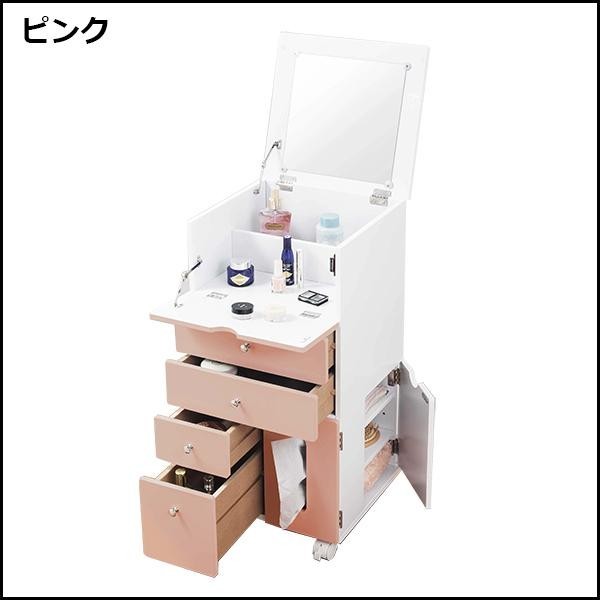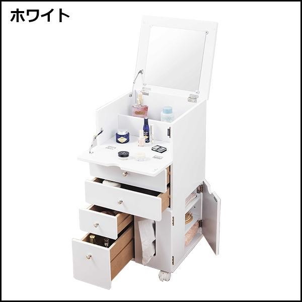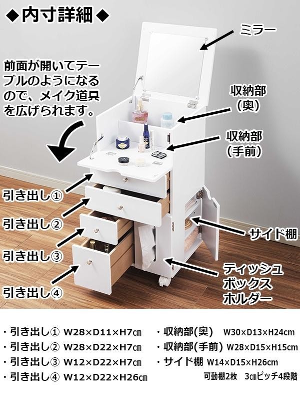 | 天板を開くと大きなミラーが!!細かいコスメから、背の高いボトル類まできちんと整理出来ます。移動に便利なキャスター付きなので、お好きな場所でメイクアップが可能です。 |