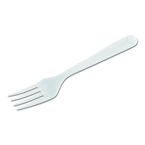 The Baily HYW-IW/F heavyweight disposable white plastic fork comes in a case of 1,000 forks, is wrapped in clear plastic film for sanitation, and is suitable for use with many dense foods such as hard fruits, fibrous vegetables, steak, and other dishes. The white plastic fork coordinates with other white utensils and many tableware designs and decorations.