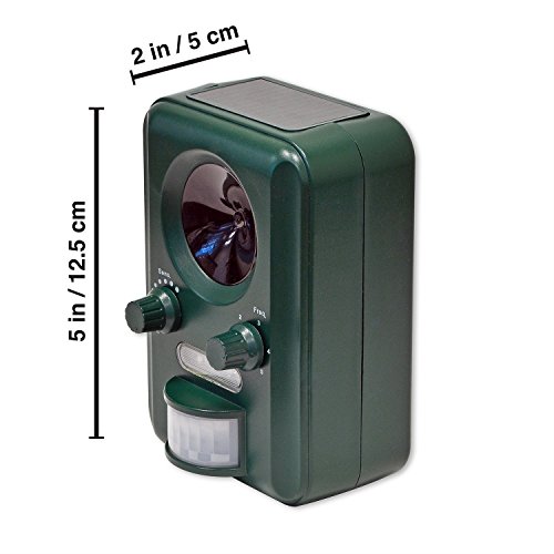 -. Feature : Keep cats and other animals away humanely using motion-activated ultrasonic frequency / Cordless; can be charged by solar power or USB cable / Includes aluminum post for installing in the lawn or garden, or attach by screws to wall, tree or post / Strobe light annoys and frightens nighttime pests like skunks and raccoons / Includes adjustable frequency and motion sensor dials. BUY 1 or MORE & GET FLAT 5% OFF. - PROMO APPLIED (Limited Time Offer)