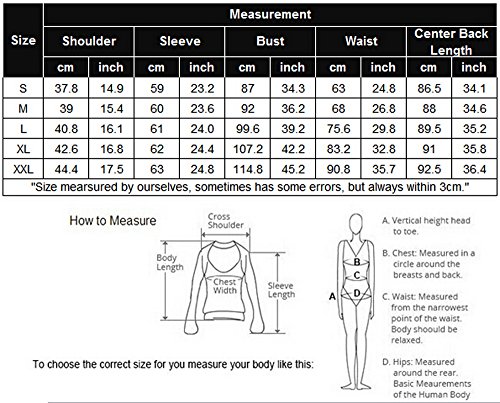 US-XL: Shoulder--16.8" Sleeve-24.4" Bust-42.2" Waist-32.8" Length-35.8"