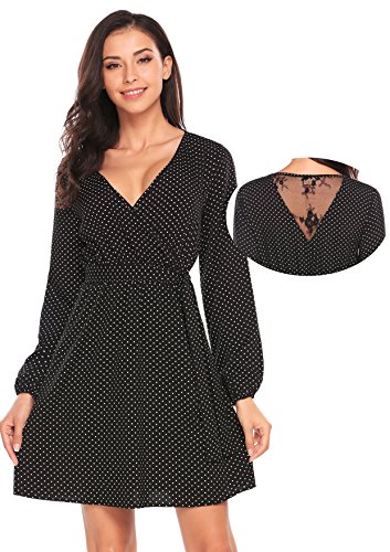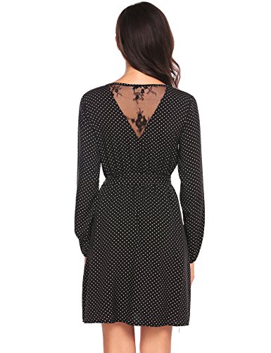Features: V-Neck, Lace detail at back, Polka Dot, Long Sleeve, Loose waist, Fit and Flare, Knee Length, crossover front design, Faux Wrap A-line Dress with Belt