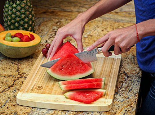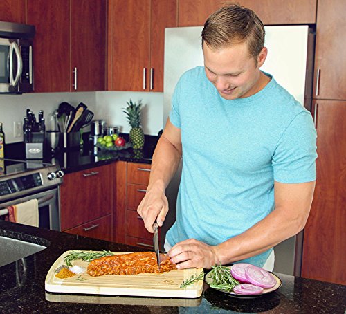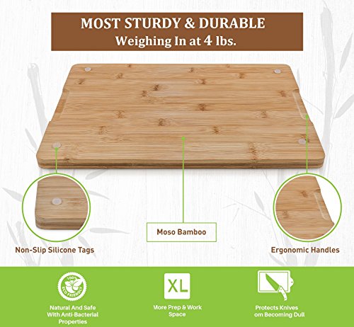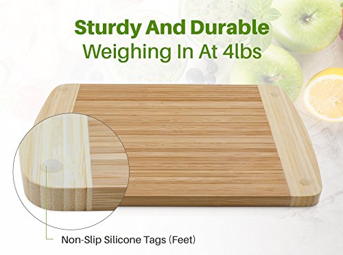 OTHER BOARDS ARE ON THE CHOPPING BLOCK! Our large bamboo cutting board is a step above the competition. With perfectly spaced deep juice grooves that trap anything that flows out, plus the non-slip pads that keep it in place this kitchen cutting board addresses all of your concerns and keeps your workspace clean. It is heavier than most other brands. We take pride in creating wood cutting boards that professional and amateur chefs can rely on to create succulent dishes with perfect knife work.