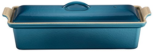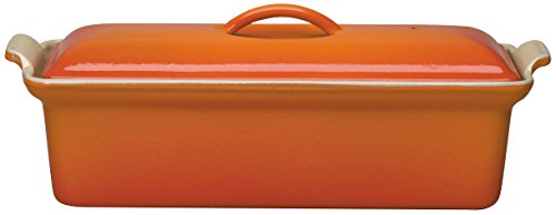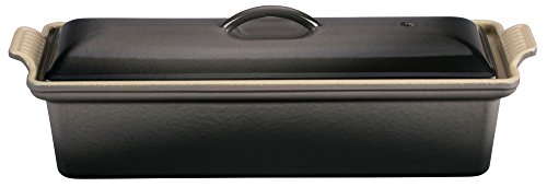 Long appreciated as both a cooking and serving dish, the terrine was traditionally used to compact a forcemeat mixture like pate (resulting form is also referred to as a terrine). some terrines include a weighted press that molds the mixture from all sides. As the meat cools, the fat contained within it begins to set, helping the terrine hold its form. Drawn from early Le creuset designs from the 1930s and 1940s, this cast-iron pate terrine also works well for baking cakes, breads, and lasagna, or for assembling a frozen dessert of sponge cake and ice-cream layers. The elongated rectangular-shaped dish measures 4 by 12-2/3 inches and can hold up to 1-1/2 quarts.Feature