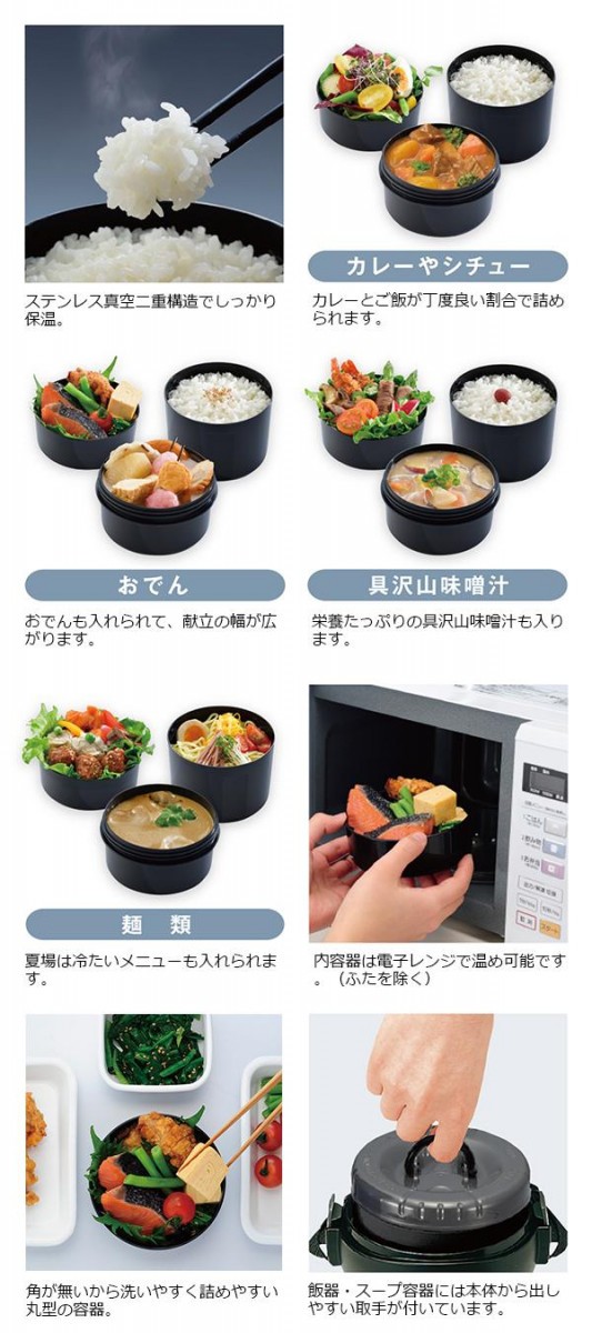 ステンレス真空二重構造の本体でしっかり保温!!セットの容器も深く、大きな具材が入れやすいので、栄養バランスの良い献立が作れます☆ハードな部活をする学生や、外で力仕事などをする男性にぴったりのランチジャーです。 |