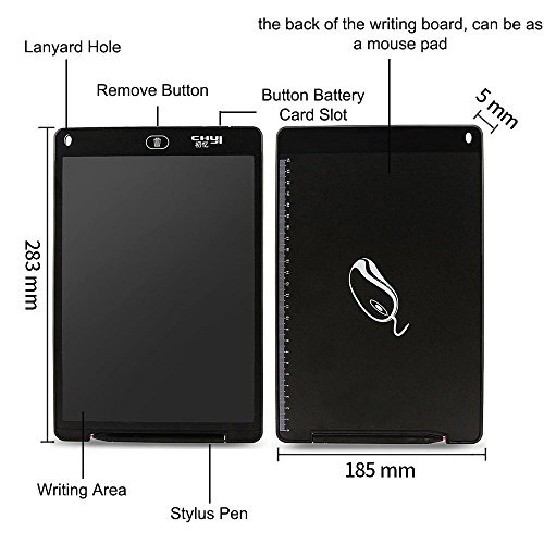 -. Feature : ? High Quality: LCD screen are made from durable, shatter-proof, non-toxic plastic, without any harmful to health, and designed with special technology to protect your eyes so you won't get tired when using the tablet, and this writing board is more brighter than before, you can use it well / ? Mouse Pad Design: The back of this writing board can be used as a mouse pad, ideal for gamers, graphic designers, or anyone who uses a mouse for long sessions. High-quality surface promotes smooth mouse gliding and enhanced precision. The thin, sleek pad helps keep you in complete control and focused on the task at hand / ? Ultra Thin: Only 0.2-inch thickness, slim, lightweight and compact size, easy to store in your briefcase, daypack, purse, lage, scheduler or backpack, do not worry about losing, children standing on the tablet do not have to worry about damage, fell to the ground is not easy to break / ? Pressure Sensitive Screen: Pressure-sensitive LCD writing surface is easy to clean and maintain. Write or draw with the included stainless steel stylus or any other suitable instrument - even your finger! You'll never need to search for a pen or pencil again / ? Easy to use and Convenient: Erase images and words with only touch of a button (this LED writing tablet allow no use of papers, pens, pencils or erasers); The button is conveniently sealed and integrated into the tablet, and it is never need to charge, rewritten times up to more than 50000 times, so you'll save millions of paper with this rewrite pads
