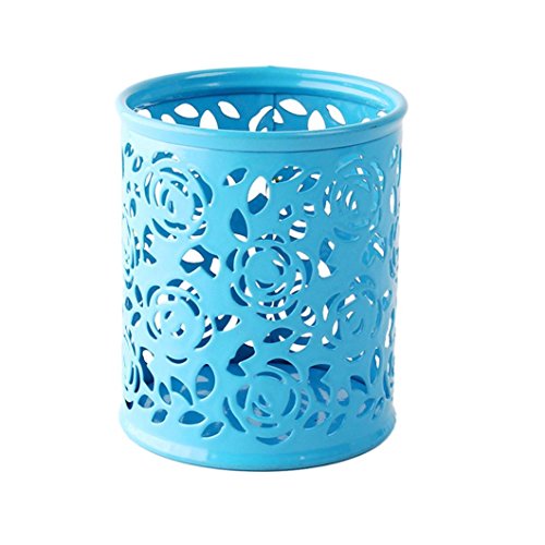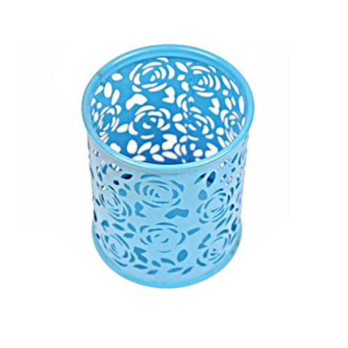 Title : TONSEE Hollow Rose Flower Pattern Metal Pen Pencil Pot Holder Organizer (Blue)