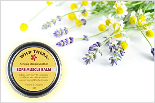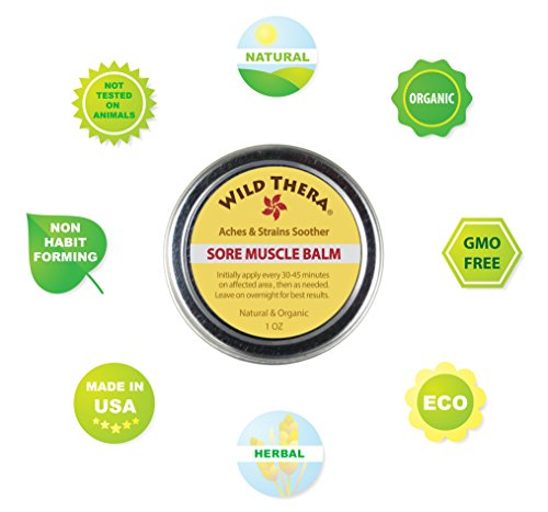 -. Feature : Wild Thera Sore Muscle Balm - provides fast acting pain relief with deep penetrating action. Specially formulated to combine traditional herbs with moderns science to relieve painful, sore and aching muscles. Cruelty Free, Not Tested On Animals, No Parabens, No Synthetic Chemicals, No PCB, No Sulfates, No Toluene, No Artificial Colors and Petroleum Free. / Formulated With Powerful Clinically Proven Herbs - Chamomile for inflammation, muscle spasms, and rheumatic pain; Arnica for pain management; Eucalyptus for arthritic pain, tendons and ligaments; and Lemon Balm to relieve stress, reduce nerve pain and induce analgesic pain relief. / Additional Safe & Effective Organic Ingredients include - St. John's Wort for bone pain; White Willow for lower back pain/sciatica, tendonitis & bursitis; Nettles for reducing nerve pain; Thyme for cramps, pain, PMS - and Menthol for general analgesia pain relief. / Alternative Muscle Pain Treatment- no drugs, no chemicals, no side effects, not addictive or habit forming. This is an All Natural treatment for Hip - Neck - Back - Shoulder - Lower Back Pain, Cramps, PMS, Carpal Tunnel, Chronic Pain, Overworked Muscle, Athletic Problems and Muscle Weakness caused by Injury, Age and Inflammation. / No Pesticides Or Chemicals. We are happy to be able to say that all of the ingredients used in Sore Muscle Balm are Natural and Organic. This is an all-natural alternative to Salonpas, Penetrex, Biofreeze, Oil and other balms and ointments. Gentle soothing effect and safe for your skin without any nasty smell like Ben Gay, Icy Hot, Tiger Balm etc.