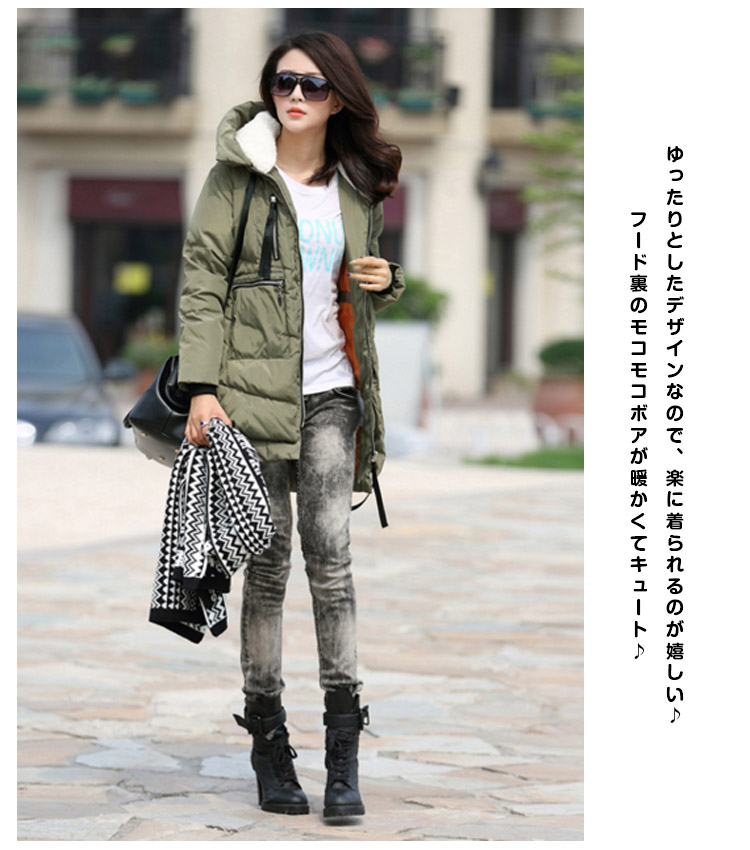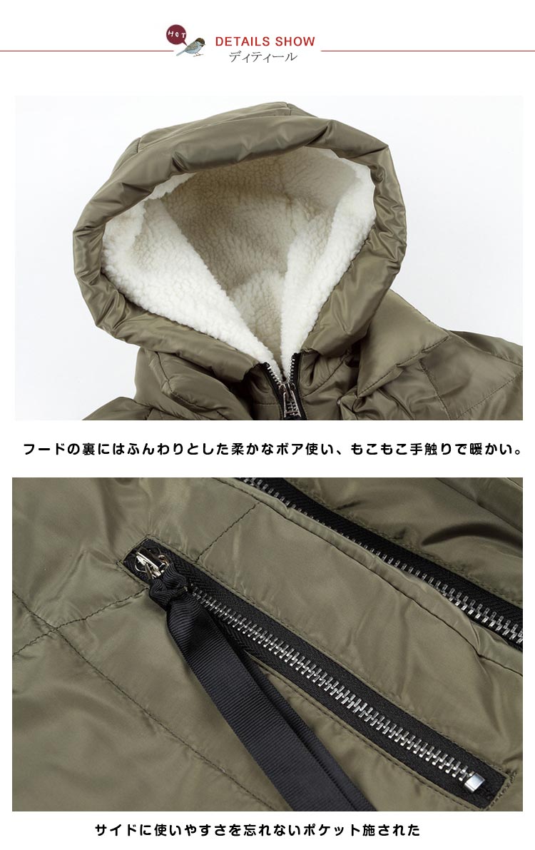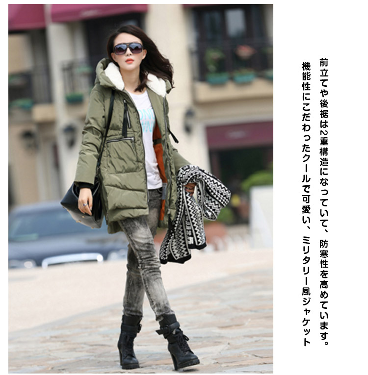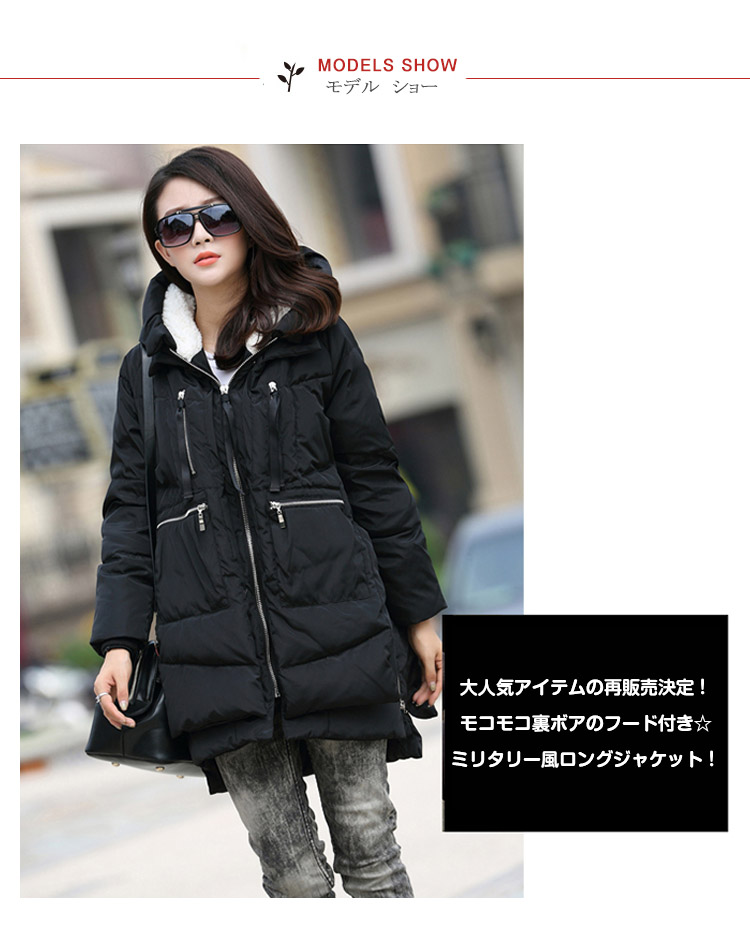 | 大人気アイテムの再販売決定!モコモコ裏ボアのフード付き☆ミリタリー風ロングジャケット!表地は超高密度のポリエステル素材で、防水性にも優れ、寒さからしっかり身体を守ります☆ゆったりとしたデザインなので、楽に着られるのが嬉しい♪フード裏のモコモコボアが暖かくてキュート♪前立てや後裾は2重構造になっていて、防寒性を高めています。機能性にこだわったクールで可愛い、ミリタリー風ジャケット | |