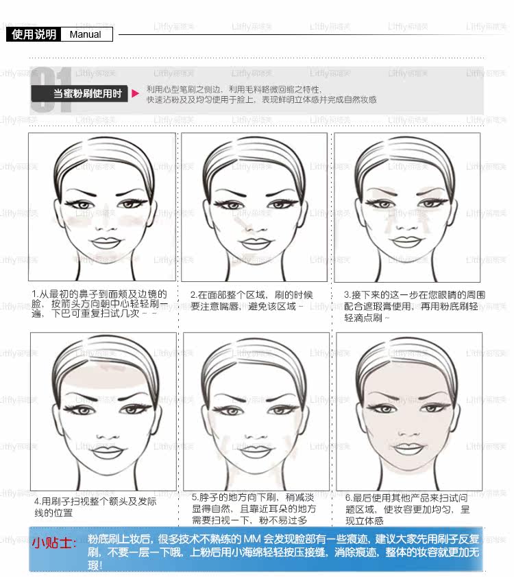 | 使用方法: | 调配粉底液。用一点点的耐心,从脸的中间往两边细致地涂抹,尤其是鼻翼,眼角处易抹匀。每次不要蘸取太多,这也是Giorgio armani彩妆提倡的粉底使用方法,可以刷出平滑的粉妆。 【小贴士】粉底刷上妆后,很多技术不熟练的MM会发现有脸部有一些痕迹,建议大家先用刷子反复刷,不要一层一下哦,上粉后还要用小海绵轻轻按压接缝处,消除痕迹,整体妆容更无暇! |