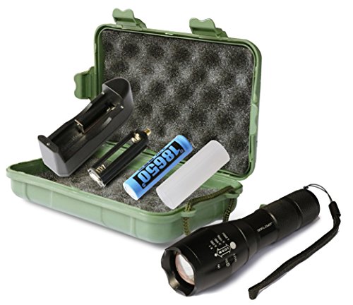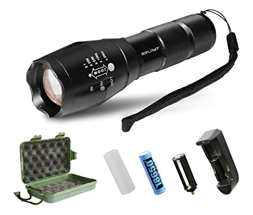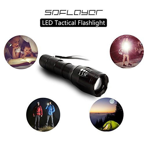 LED Tactical Flashlight,SDFLAYER T6 High Powered Handheld Torch with Rechargeable 18650 Lithium Ion Battery and Charger , 5 Modes Zoomable Adjustable Focus For Hiking, Camping, Emergency
