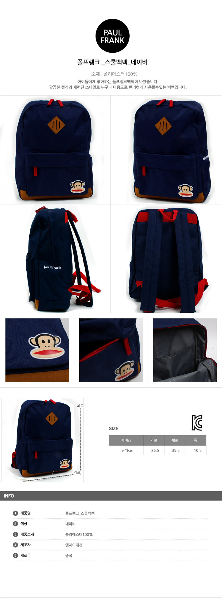 - 품명 및 모델명[키즈나라] 캐릭터 아동가방 폴프랭크 스쿨백팩_네이비