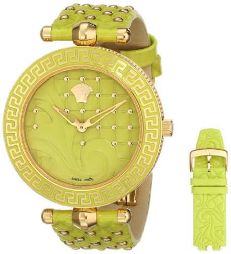 -. Binding : Watch -. Brand : VERSACE -. Color : Silver/Black -. Department : womens -. EAN : 7630030500459 -. Feature : Ronda 762.3- Swiss quartz movement / Rose gold IP coated stainless steel case / Lime green quilted leather strap with small studs; additional strap with baroque pattern in relief- 27 mm / Lime green dial with baroque pattern in relief / Water resistant to 99 feet (30 M): withstands rain and splashes of water, but not showering or submersion -. Label : VERSACE -. Manufacturer : VERSACE -. Model : VK7110014 -. MPN : VK7110014 -. PackageQuantity : 1 -. PartNumber : VK7110014 -. ProductGroup : Watch -. ProductTypeName : WATCH -. Publisher : VERSACE -. ReleaseDate : 2014-02-26 -. Size : Standard -. Studio : VERSACE -. Title : VERSACE Women's VK7110014 VANITAS Analog Display Quartz Green Watch
