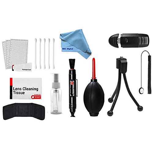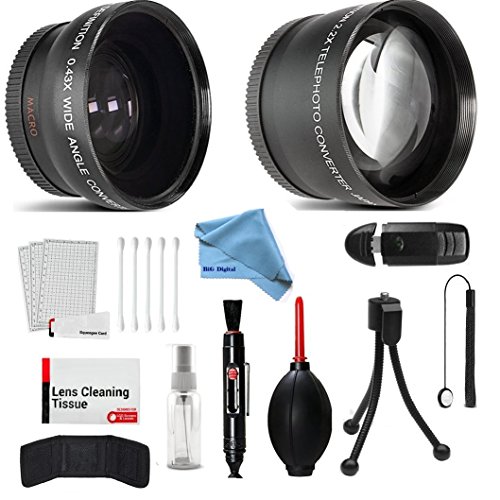 Kit includes 0.43x Wide angle Lens with macro attachment, 2.2x Telephoto Lens with macro attachement with lens caps and carrying pouches. Also includes DELUXE PHOTO ACCESSORIES KIT- Fiber cleaning cloth, Lens Cleaning Kit (cotton swabs, 50 pc cleaning tissues, cleaning fluid) Dust blower, Lens cleaning pen, 3 pc screen protector, lens cap keeper, Tripod, Memory Card Wallet, SD Card Reader.