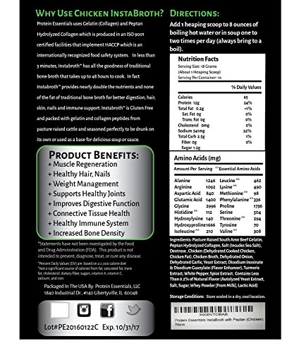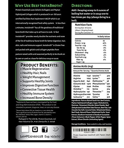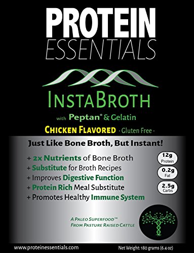-. Binding : Grocery -. Brand : Protein Essentials -. Feature : Delicious, nutritious rich gelatin bone broth in an instant! / Protein, minerals and vitamins aid in skin, bone and joint health / Gluten free, dairy free, no added sugar, paleo superfood / Supports better digestion by aiding in the natural detoxification process / Naturally inspired from pasture raised collagen; 25g protein -. Label : Protein Essentials LLC -. Manufacturer : Protein Essentials LLC -. PackageQuantity : 1 -. ProductGroup : Grocery -. ProductTypeName : GROCERY -. Publisher : Protein Essentials LLC -. Studio : Protein Essentials LLC -. Title : Protein Essentials InstaBroth with Peptan® Collagen - Gelatin - Protein - Nutrition - For the Digestive System - Joint Pain Relief - Health and Wellness - Gluten Free - Soup