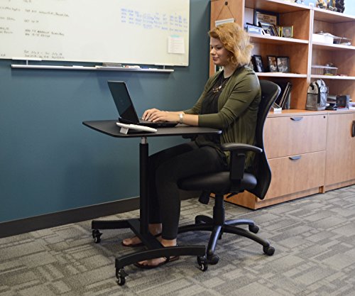 -. Feature : Sit or stand with the adjustable desk height of 29" to 44". Assembles in minutes. / High strength gas strut provides fast and easy height adjustment with the pull of a lever. Lowers to a seated position. / Four heavy-duty steel casters with rubber wheels glide effortlessly over hard or carpeted floors and lock for stationary stability / Sturdy all-steel frame is built to last. Large 31" wide by 22" deep surface is made from durable wood with a scratch resistant PVC coating. / Multi-functional table can be used in multiple settings, including office, classroom, production set, crafting, home projects, workshops, warehouse, flea markets, lectern speeches, healthcare, and any other application where mobility and height adjustment helps get the job done.
