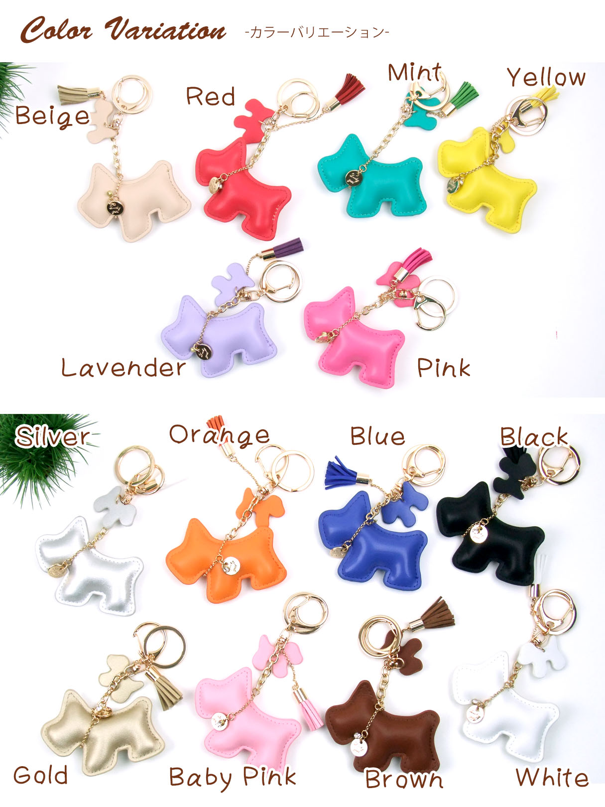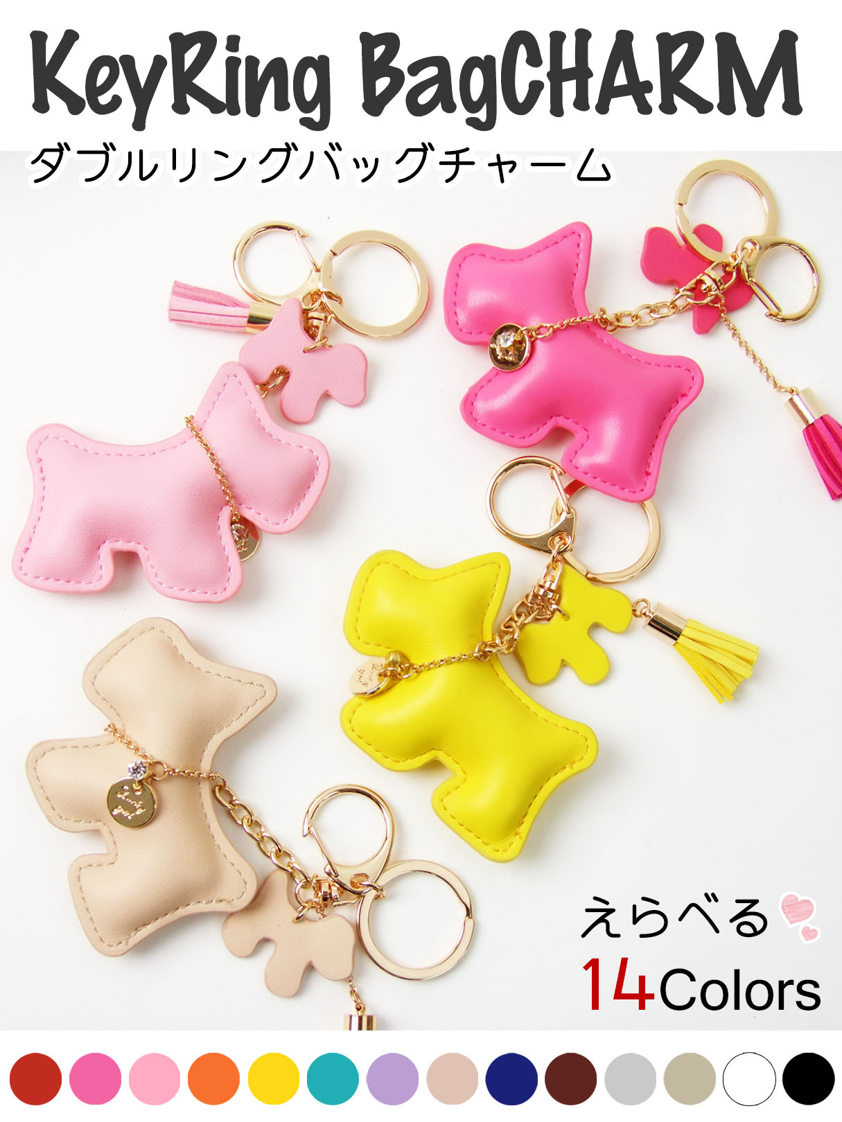 【かわいいバッグチャームが入荷!】ぷっくり可愛いワンちゃんのバッグチャームで選べる全14カラー!プレーンなPUレザー素材で、ステッチでかたどられたワンちゃんがとてもキュート。リング部分には子犬もいてセットになっています!キーリングとフックの2WAYで使用でき、タッセルと子犬がゆらゆら揺れるかわいいチャームキーホルダー。バッグだけでなくスマホケースや鍵にもつけられるのでとても便利です!豊富なカラーバリエーションで簡単なお土産などにもピッタリですね。