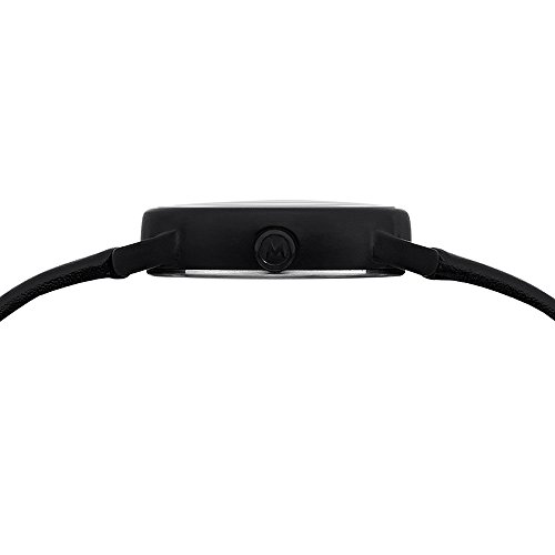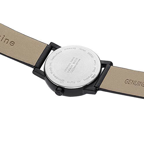 Mondaine A669.30305.61SBB Evo women's watch features a 30mm wide and 9mm thick black ion plated solid stainless steel case with a fixed bezel and smooth push-pull crown. Mondaine A669.30305.61SBB is powered by an accurate Swiss Made Ronda 509 quartz movement. This beautiful watch also features a sharp looking milky white dial with black luminous hands and index hour markers along with the big date display function, scratch resistant hardened mineral crystal and water resistant to 30 meters. Mondaine A669.30305.61SBB is equipped with a 16mm wide black leather strap with a buckle clasp. Mondaine A669.30305.61SBB women's Evo white dial black IP steel black leather strap watch is brand new and comes in an original Mondaine gift box and is backed by a 2 years limited warranty.
