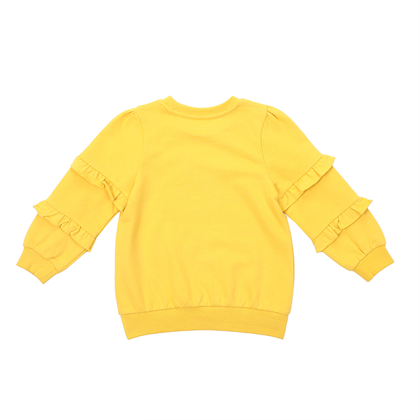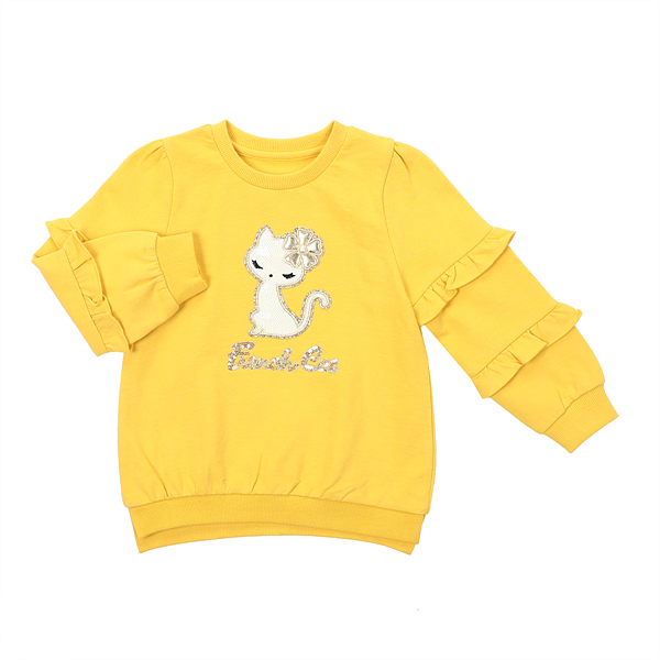 상품설명 머스타드 프릴 롱TS입니다. 소매에 들어간 2단 프릴단이 너무나 사랑스러운데요. 편안한 핏감에 큐트한 플라워캣스팽글자수로 활동성과 특별함을 함께 연출해보세요.