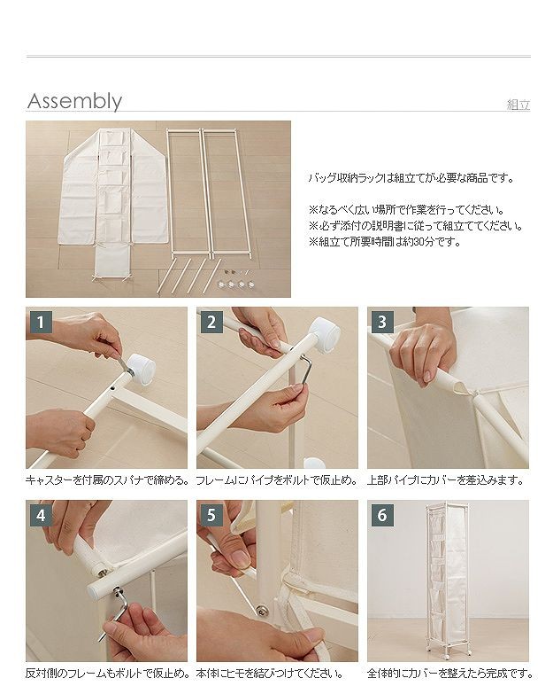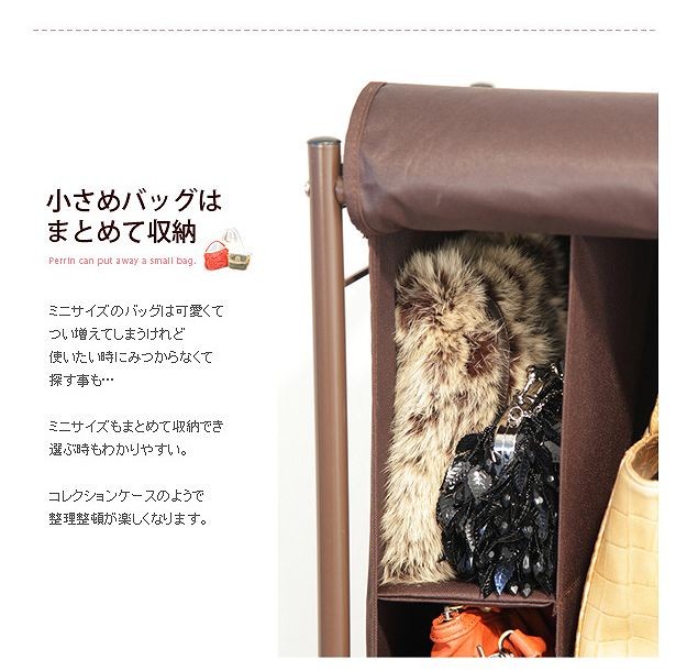 ※メーカー直送のため代金引換はお受けできません。※沖縄・一部離島は別途送料がかかります。お見積もりいたしますのでお問い合わせ下さい。バッグ収納ラック3連。どんどん増えて収納場所に困るバッグを省スペースにスッキリ整理整頓。バッグの型崩れやホコリを防いで1か所にまとめて保管できるラックです。最下段収納部の仕切りは取り外せるので幅のある大きめバッグも収納OK!側面には普段使いの小物収納に便利なポケット付き。カバーは前後に付いているので、使いやすい向きに置いてお使いいただけます。サイズ(cm):幅40x奥行36x高さ149(キャスター含む)・約4.5kgバッグ収納部(cm):幅11.5x奥行27.5x高さ22.5(4段)・30(中央の3段)・40(最下段)カラー:アイボリー・ブラウン材質:本体-スチール(粉体塗装)、カバー生地-ポリエステル100%キャスター4個付(2個ストッパー付)組立品メーカー:株式会社ナカムラ(h0700030)