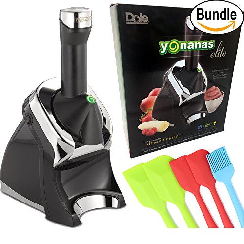 The Yonanas Elite is the ultimate Yonanas Experience. It is the strongest, most quiet and durable Yonanas maker available. Yonanas turns frozen fruit and other flavorings into a delicious, healthy soft-serve treat. The unit combines frozen bananas and any additional fruit or chocolate and instantly churns the ingredients to produce a treat with the texture of frozen yogurt or soft-serve ice cream, but without the additional fat, sugar, or preservatives. The chute easily accepts berries, sliced mango, or cantaloupe along with frozen banana and the integrated spinning blade mashes and incorporates the fruit into a silky-smooth confection with the texture of soft-serve ice cream or yogurt. The chute, plunger and blade are dishwasher safe. This is only designed for US market. Yonanas Elite has two times more power than the original Yonanas and transforms frozen fruit in seconds. Peel and freeze over-ripe bananas and other fruits. Insert frozen bananas and other frozen fruit into the chute. Add toppings and the flavor combinations are endless. Enjoy guilt-free desserts. --- Win House Silicone Spatula Set, Heat-Resistant Spatulas, Multi-Color Non-stick Rubber Spatulas with Stainless Steel Core. Heat resistant up to 500 degrees F. Non-stick, Stain resistant and Odor resistant. Hygienic silicone scraper BPA-free and FDA approved. Solid steel core construction for a comfortable hold. High quality and Flexible one piece silicone head design. This Bundle Includes: 1 x Yonanas Elite Frozen Healthy Dessert Maker - 100% Fruit Soft-Serve Maker, 2 x Red Large Silicone Spatula: 11", 2 x Yellow Mini Silicone Spatula: 8" & 1 x Blue Silicone Brush (US 100-120V for use within the USA.)Feature
