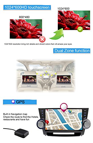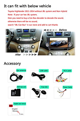 - Feature : Plug and Play in-dash vehicle gps units can fit to Non-JBL Toyota Highlander 2011 2012 2013 2014, if your car has JBL sound system, then you need to buy a Can Bus decoder to decode the sound, otherwise there will be no sound, search "Can Bus" in our store and add to cart thanks / Loaded with pure Android 4.4.4 Kitkat, RK3066 1.6GHz Cortex A9 Dual Core CPU, Samsung DDR3 1GB RAM and 8GB flash memory, Mali 400MP GPU; Adopts Capacitive Digital 1024*600 HD screen, multi-touch, 175 viewing angle, day and night readable / Built-in GPS navigation; Bulit-in Bluetooth for hands-free calling and phone music playing; Support OBD2, AV-IN reverse camera, Digital Video Recorder, Steeing Wheel Control; Built-in WiFi, 3G and hotspot / NO DVD; Support iphone 4s 5 5c 5s 6 Airplay, Android phone Mirror link; 30 stations of analog AM/FM RDS radio; Support iPhone audio input, Play music or video via SD card or USB; Support Dual Zone function; Support 1080P video and 3D game; Support subwoofer and EQ / Free external and Free map in a Free 8GB map card; 12 months warranty for quality-related issues;