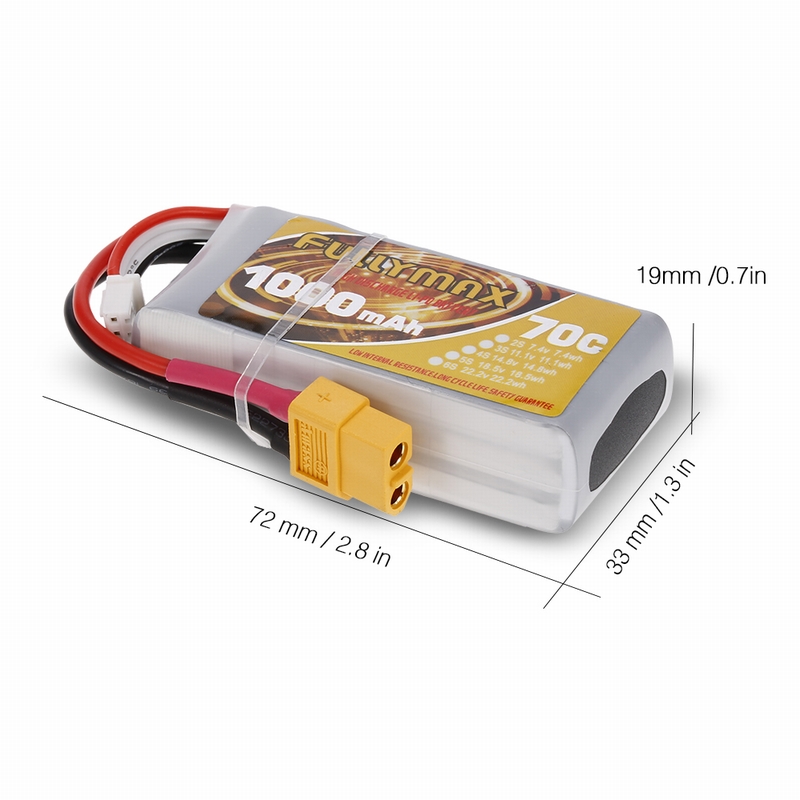 FULLYMAX 3S 11.1V 1000mAh 70C li-po battery with XT60 for RC fans. This battery is suitable for 180, 210, 250 wheelbase RC FPV racing drone and other RC car and boat with XT60 plug. Perfect choice for you to enjoy more flying fun.