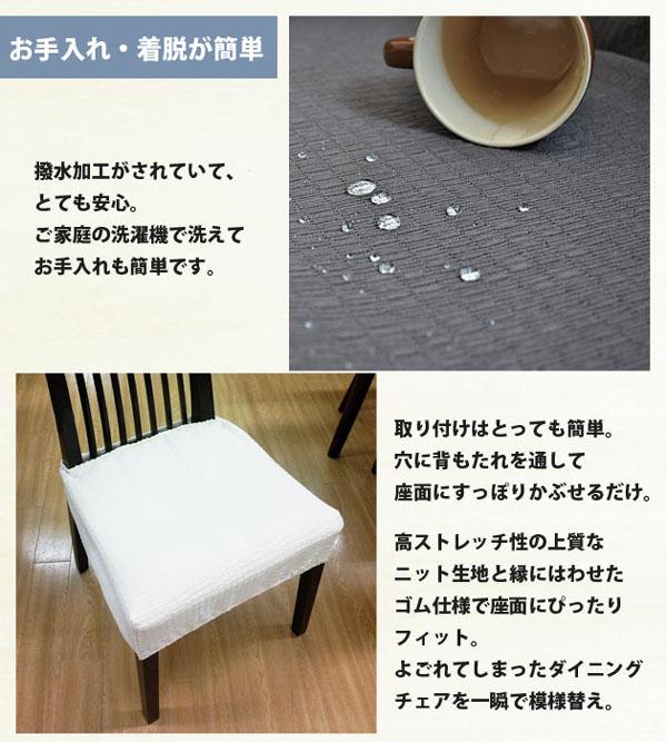 | 伸縮性の高いストレッチニット素材で肌触りも気持ちいい座面カバー。撥水加工も施してあり、洗濯機で洗えるのでお手入れも簡単です。すっぽり被せて形を整えるだけのお手軽装着でどなたでも簡単に着脱ができるのも魅力です。 |