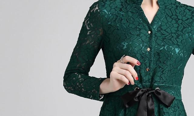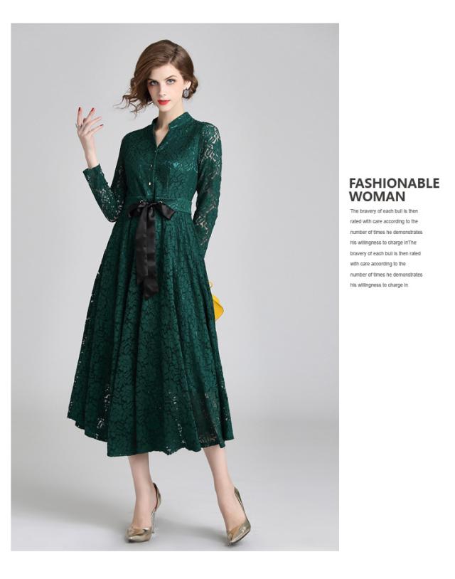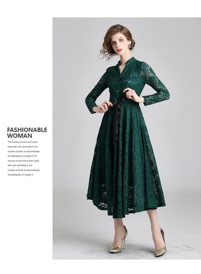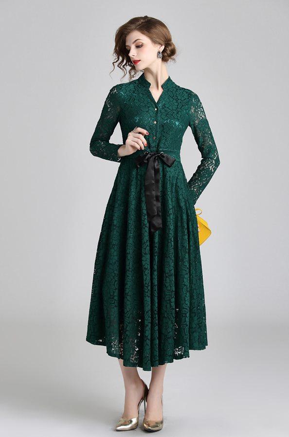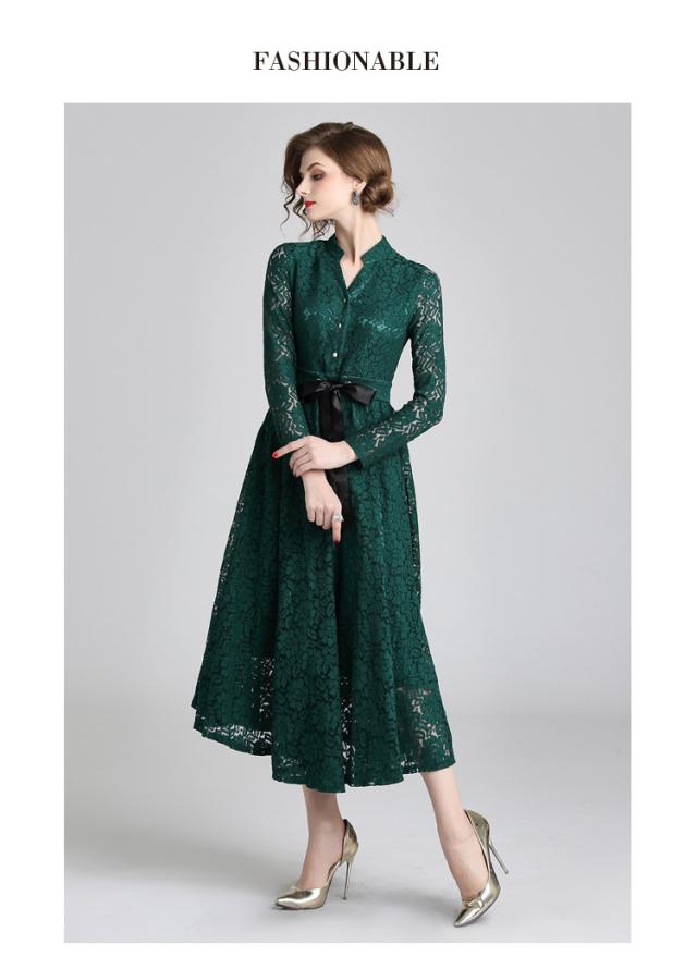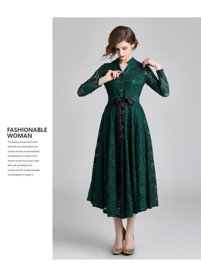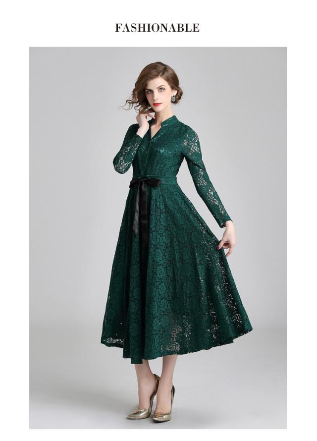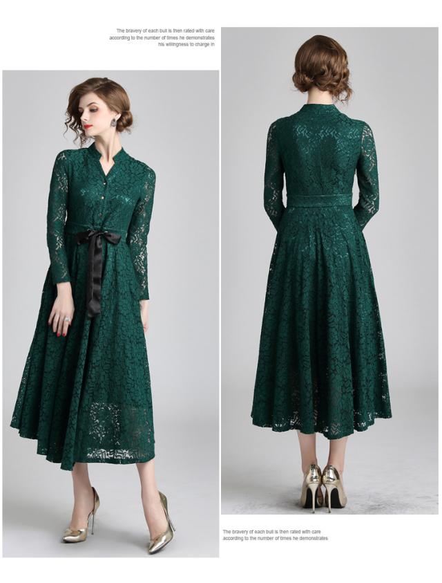 レース 刺繍 ?ネック マキシ丈 リボンベルト 長袖 スタンドカラー ドレス ワンピース 結婚式 二次会 パーティー ディナー 女子会 卒業式 謝恩会 コンサート