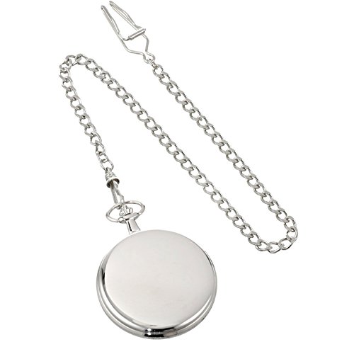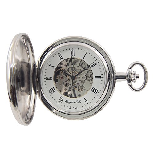 -. Feature : Chrome finish brass 50mm hunter case with a matching curb chain / Skeleton dial with roman numerals / 17 jewel mechanical movement / Deluxe gift box