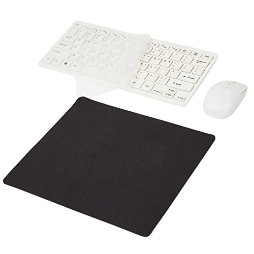 -. Feature : The keyboard is very light and thick, it has two colors,black and white,you can chose the color you like. / The wireless keyboard and mouse can easily connect to your computer only with a tiny nano-receiver. It can be used within 30 feet range with quick response. The receiver is stored in the mouse so that it's not easy to lose,you can carry it when you are traveling o on a business trip. / The precision mouse is adjustable for DPI 1000,1200,1600, the maximum acceleration is 14 inches per second. / We prepared a complete set for you, the mouse pad and keyboard cover film is free for you. The matching keyboard cover film will keep your keyboard away from dust. Size of the mouse pad is 8.7*7''. / The set is power saving,when you don't use it for a long time,it will keep in standby mode.The keyboard needs two AAA batteries and the mouse needs one AAA batteries.