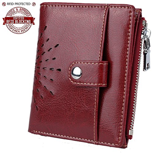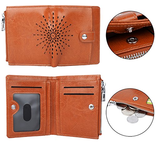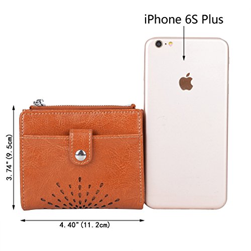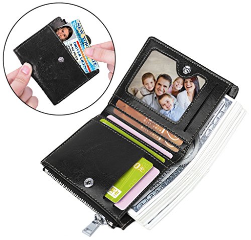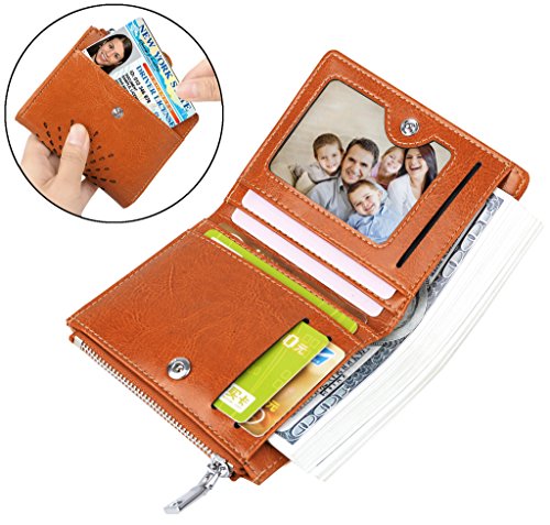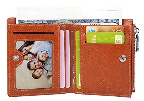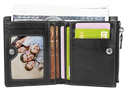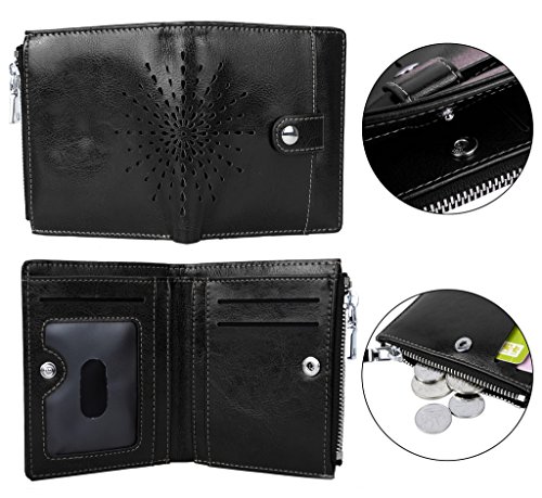 -. Feature : RFID PROTECTED -- Customer Tested and Recommended, Effectively Protect your valuable data and block RFID readers from scanning your credit cards, debit cards, banking information, smartcards, RFID driver's licenses and other RFID cards. Shield Against Electronic Pickpocketing with this RFID wallet! / HIGH QUALITY --- Made from Cow Split Leather; smooth silver-tone zipper; sturdy streamlined stitching. Designed to fit into your small crossbody purse. / LARGE CAPACITY --- 7 card slots including 2 photo slots; 1 coin pocket; 1 bill section. It stays closed when stuffed. / EASY ACCESS -- Bifold style and small size is designed for you to keep your wallet slim and get easy access to the cards you need. Stay organized anytime! / DIMENSIONS: 4.40" x 0.78" x 3.74". This is a cute yet functional little wallet.
